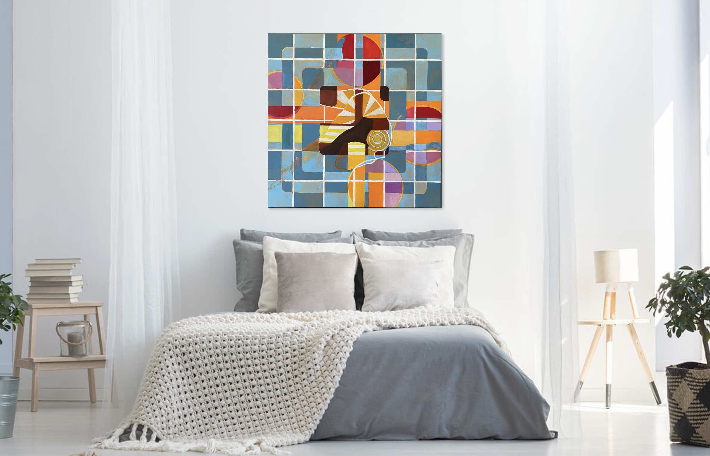 Le mélange de couleurs chaudes et froides, complémentaires, tels que le bleu et l’orangé, les harmonies et contrastes composent un univers d’équilibre et de déséquilibre animé par des rayures, des mosaïques, des lignes de fuite dynamiques.